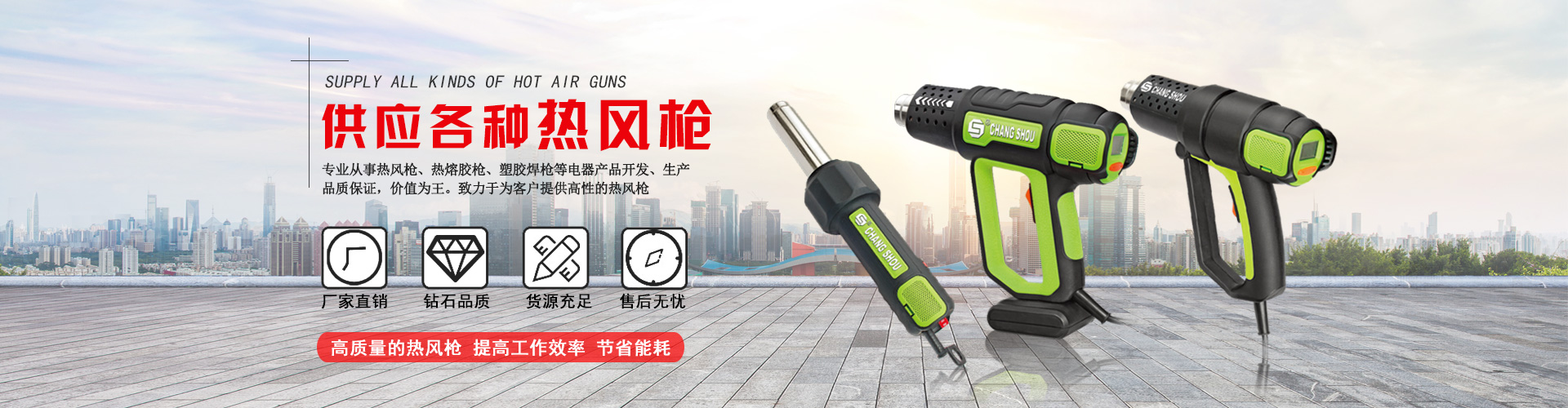 本廠 始建于1994年, 擁有塑膠件注塑生產(chǎn)加工、發(fā)熱芯生產(chǎn)線、成品裝配線,是從事電熱工具:熱風(fēng)槍、熱熔膠槍、塑膠焊槍等電器產(chǎn)品開發(fā)、生產(chǎn)的專業(yè)廠家,擁有二十多年的生產(chǎn)經(jīng)驗,其中工業(yè)用的調(diào)溫、恒溫、數(shù)字顯示、數(shù)字控制溫度的熱風(fēng)槍、熱熔膠槍已處于國際地位,并獲得多項專利。2000年榮獲《質(zhì)量監(jiān)督檢測中心合格產(chǎn)品》,2002年經(jīng)德國CE認(rèn)證中心認(rèn)證,榮獲CE證書。2003年榮 獲國家輕工部頒發(fā)的《中國名優(yōu)產(chǎn)品》證書,并...